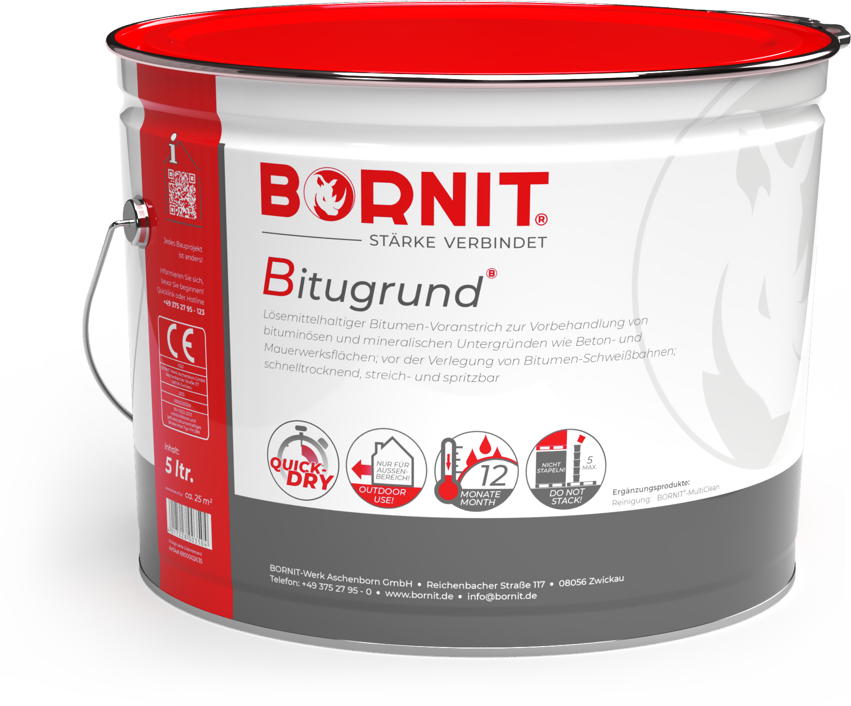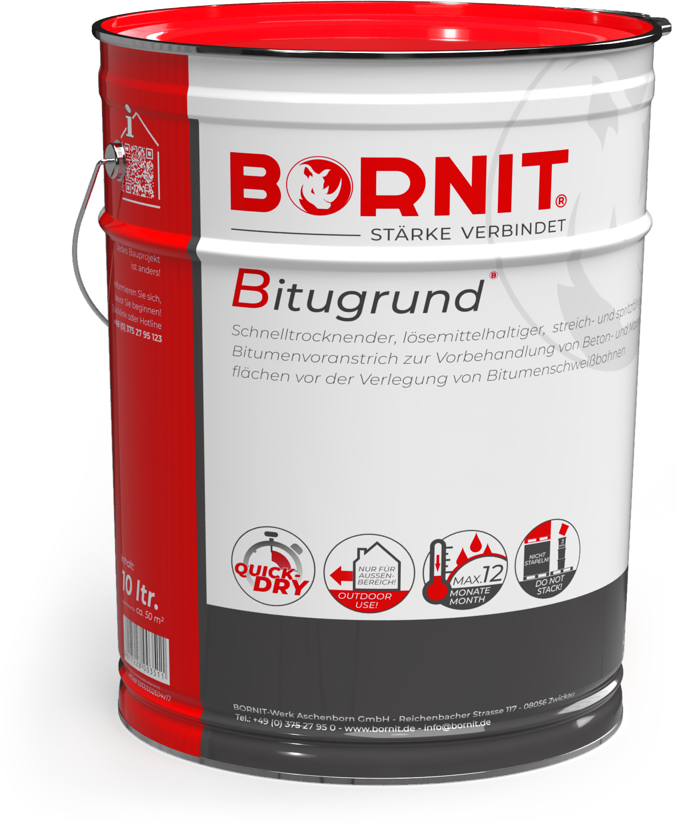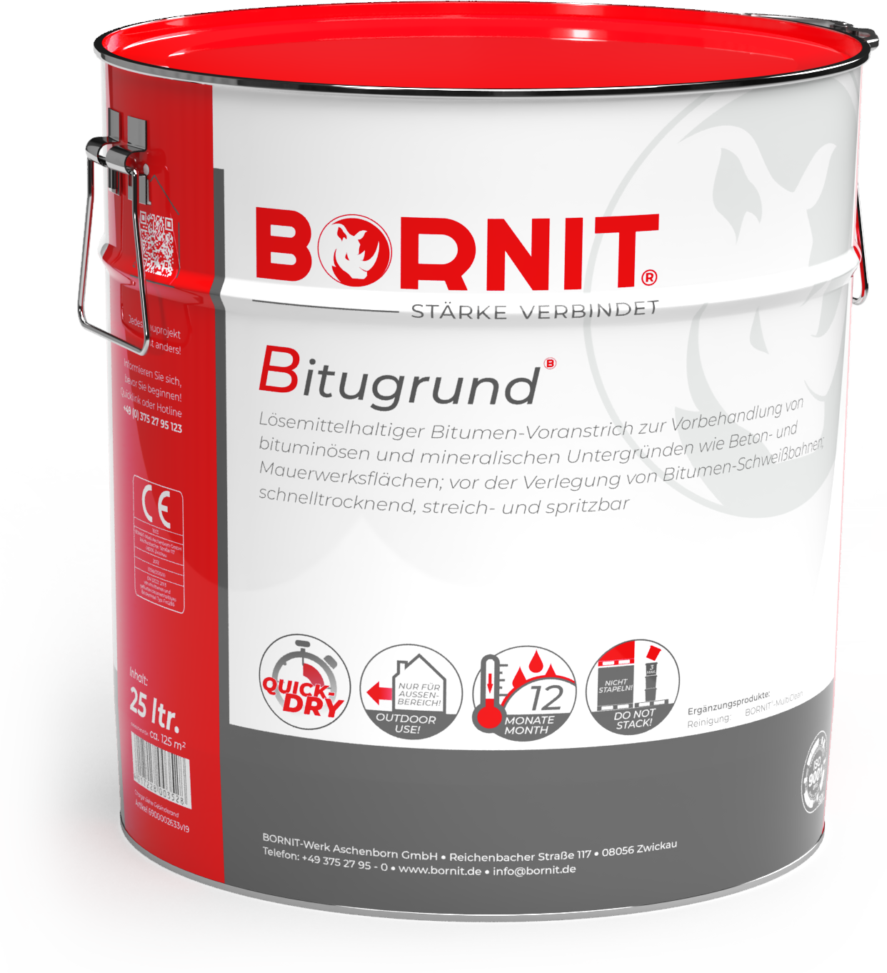BORNIT®-Bitugrund est également recommandé comme primaire hydrophobe pour les revêtements bitumineux à froid BORNIT® Dachlack, BORNIT® Korrosionsschutz KS, BORNIT® Isolieranstrich, ainsi que pour BORNIT® Kaltkleber.