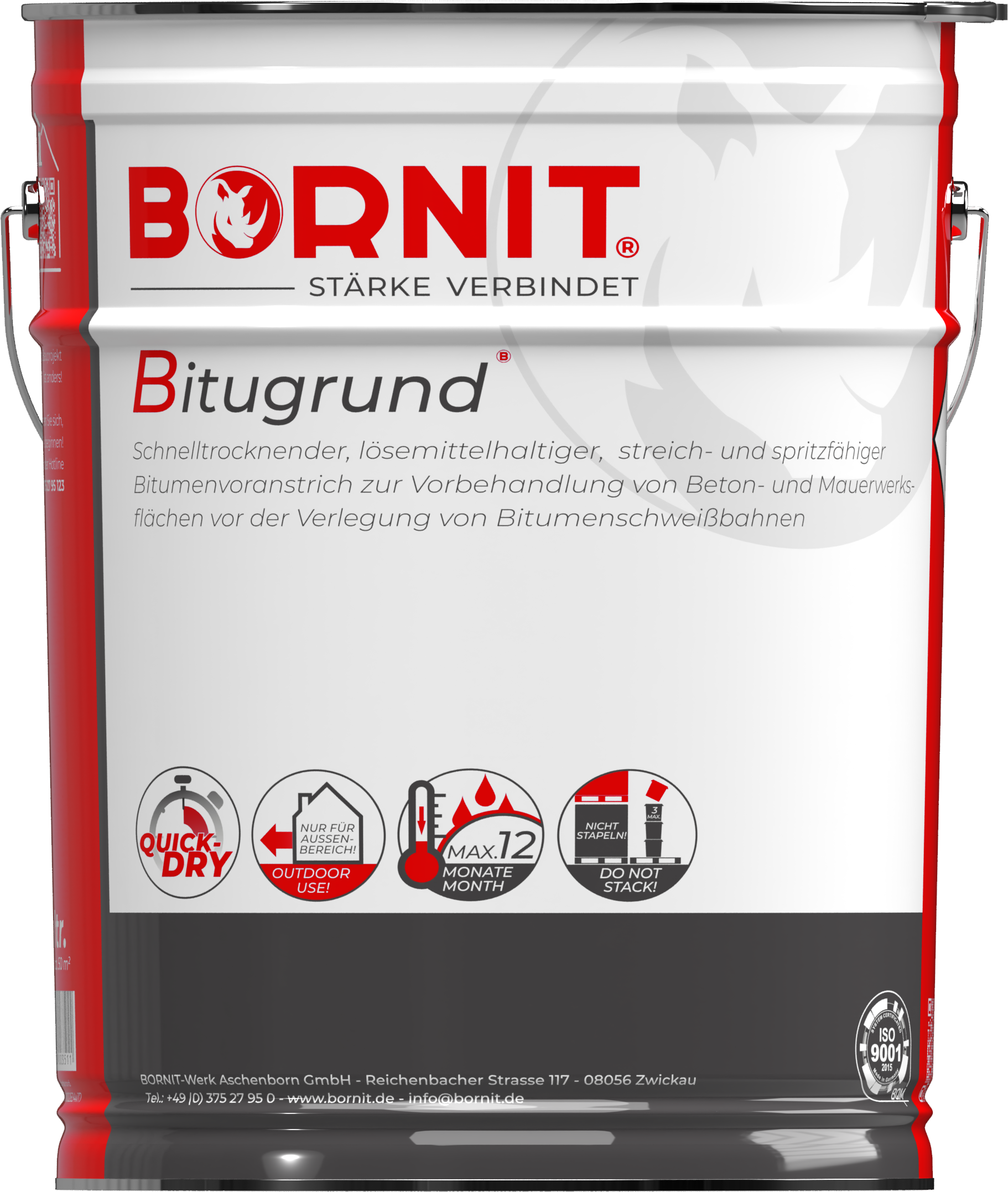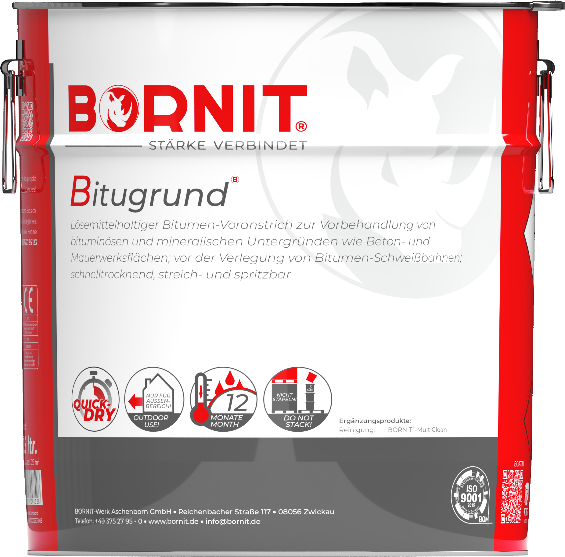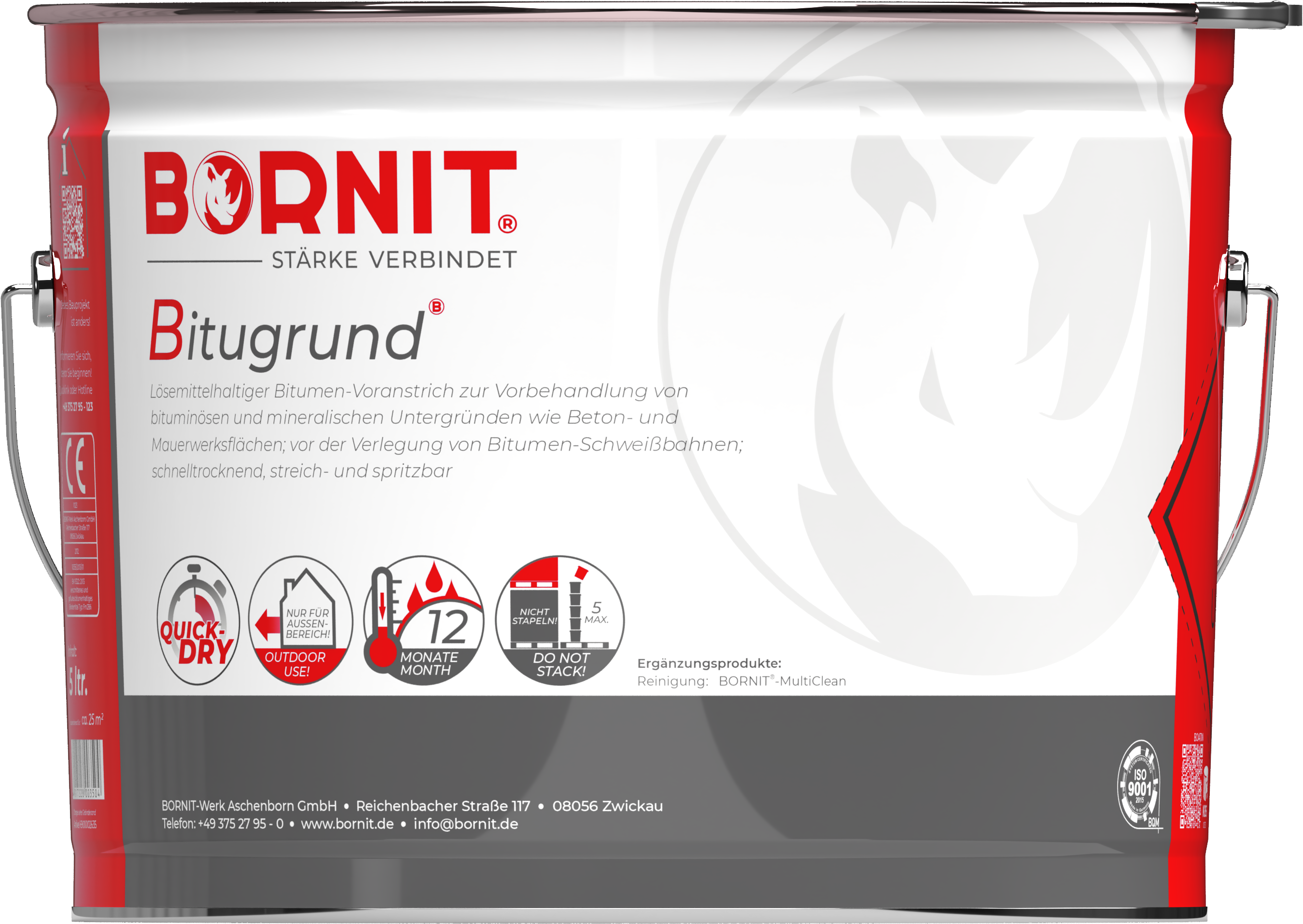 BORNIT® Bitugrund est un primaire indispensable pour le prétraitement des étanchéités bitumineuses à chaud ainsi que pour la pose de membranes de toiture et de membranes bitumineuses soudées. BORNIT® Bitugrund adhère au béton, à la maçonnerie, à l’enduit et à presque tous les autres supports courants dans le bâtiment, ainsi qu’au métal. BORNIT® Bitugrund n’est pas adapté à une application sur polystyrène expansé ou extrudé.